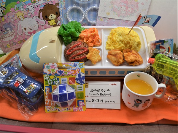 Bright visual copies of kids menu items in a display window catch attention of kids and their parents. Children instantly notice treats in unusual colorful plates, and bright toys to go with the meal.
